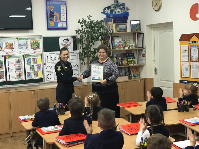 31 січня полейські патрульної поліції Херсонськоі області А.Вах та А.Вахтель урочисто вручили Гладченко О.А. та учням 1-Б класу "Подяку...