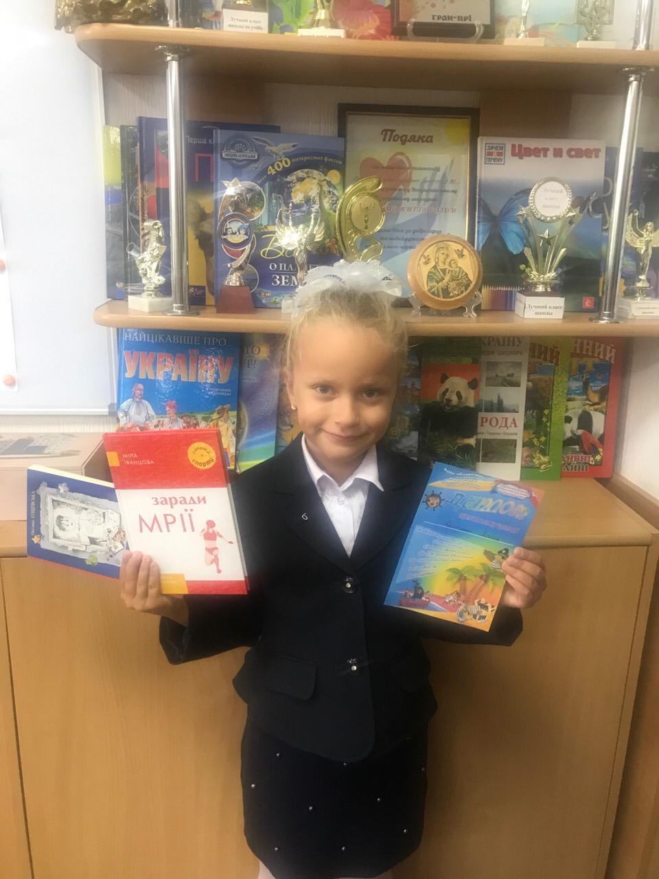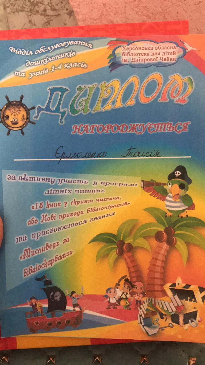 Вітаємо ученицю 2-Б класу (класовод Гладченко О.А.) Єрмоленко Таісію як самого активного читача під час літніх канікул Херсонської обласної бібліотеки для дітей імені Дніпрової Чайки.
